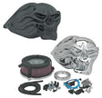 There are other skull-style air cleaners on the market but non of them is as aggressive looking as our Flying Skull. Apart from its awesome looks it is also a true performance upgrade as the air cleaner backing plate features an incorporated "Super Sucker" velocity stack. Kit comes complete with mounting instructions chrome plated or black coated die-cast air cleaner cover Hi-Flow filter element backing plate air cleaner support bracket breather bolts and all other required hardware for a quick and easy installation.